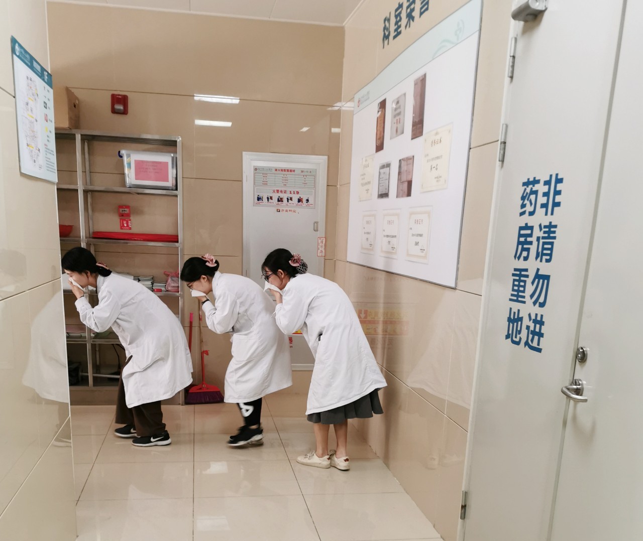 藥房負責(zé)人組長廖偉東關(guān)閉門窗,逐個房間檢查,是否遺漏人員,所有人到達安全地點集合,清點疏散人數(shù)。