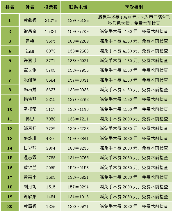 通過廣大網(wǎng)民的積極參與和踴躍投票,按照《市三院全飛秒形象大使評選方案》的評選規(guī)則,現(xiàn)將全飛秒形象大使“全飛秒形象大使”征集情況給予公示。