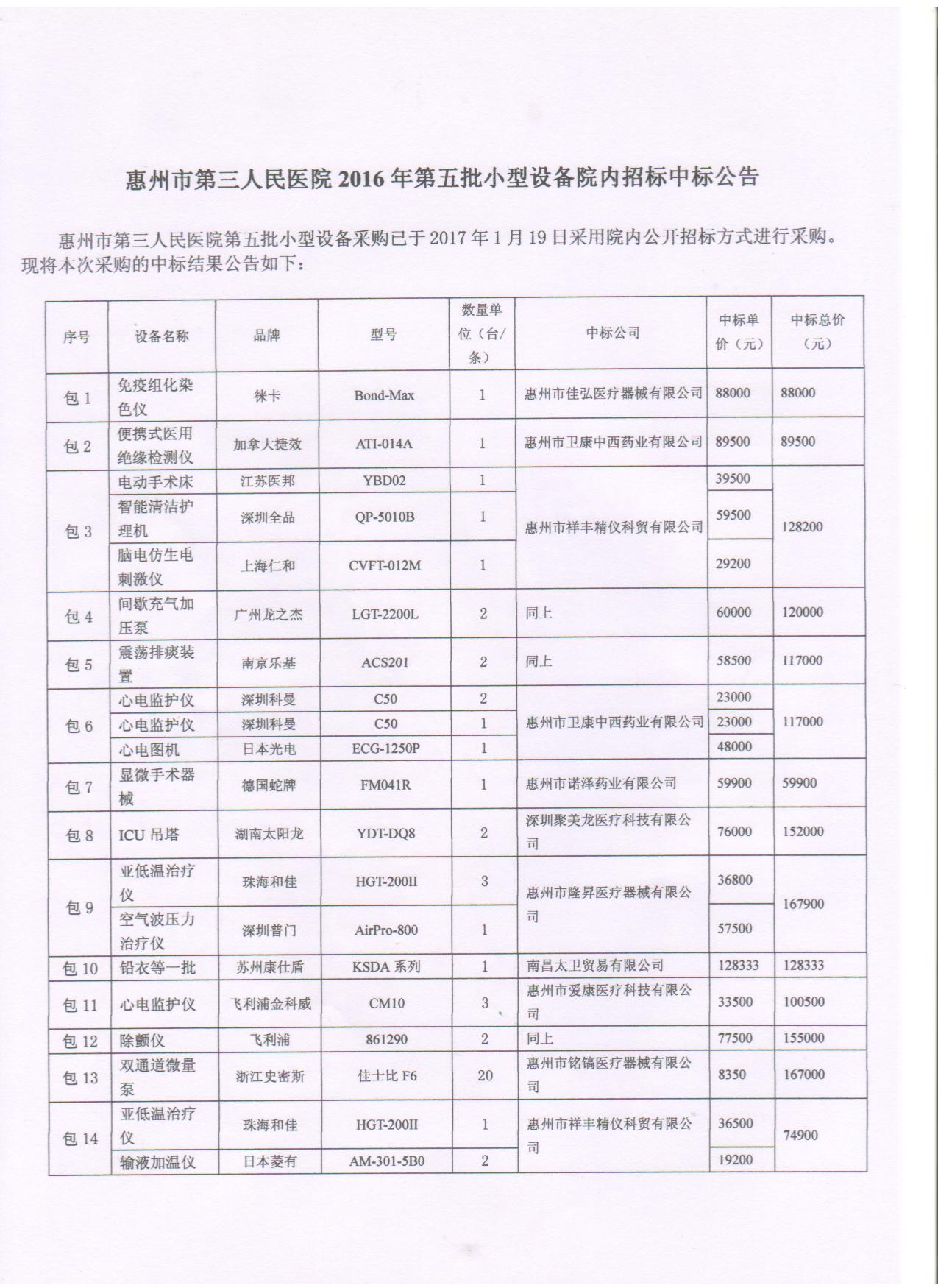 惠州市第三人民醫(yī)院2016年第5批小型醫(yī)療設(shè)備院內(nèi)招標(biāo)中標(biāo)公告