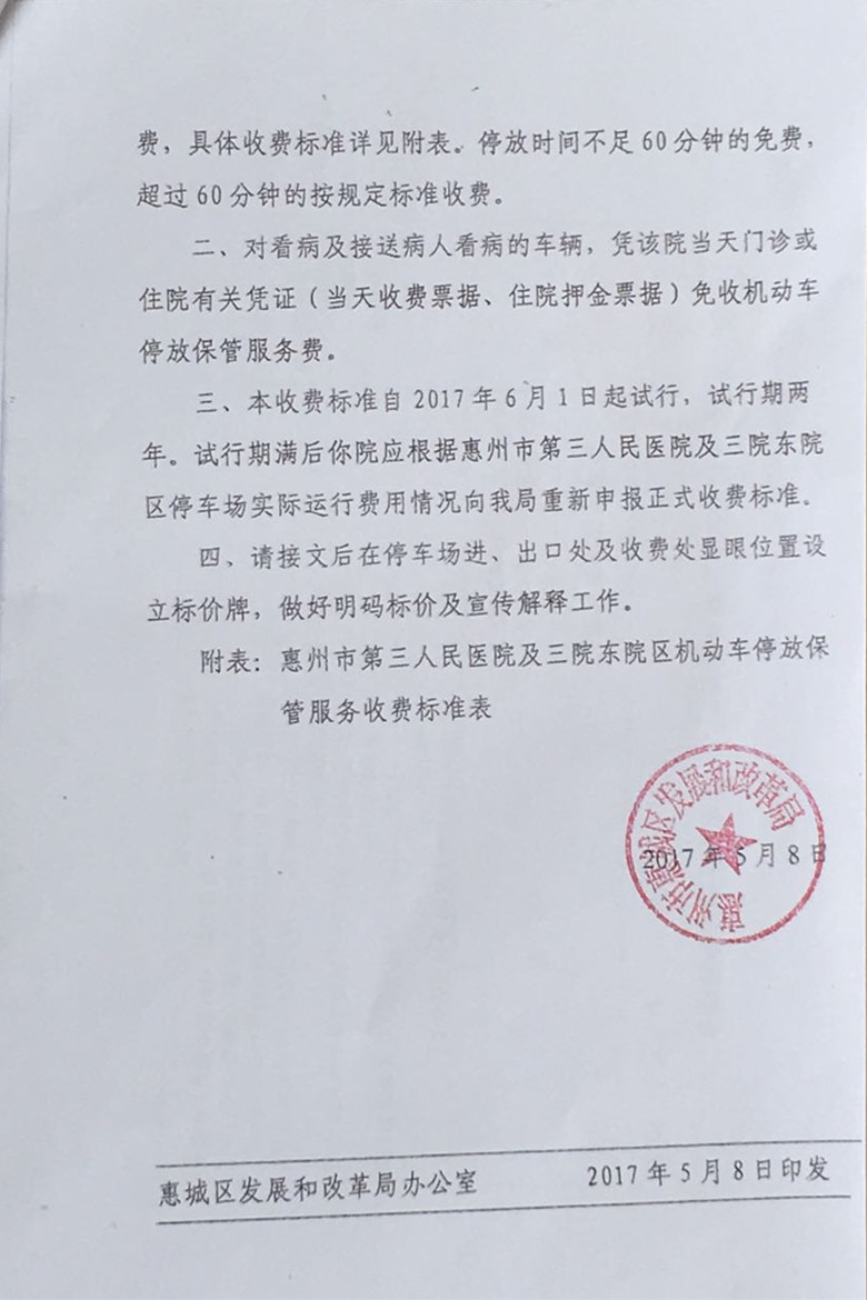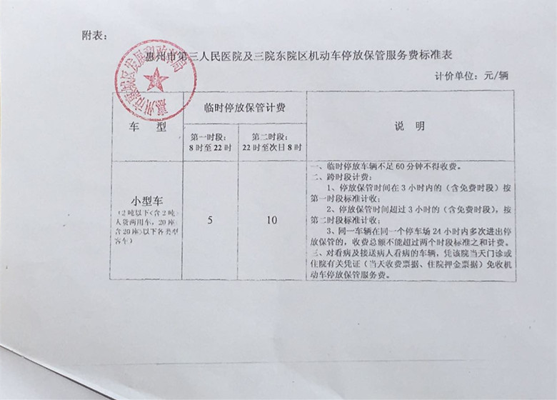 惠州市第三人民醫(yī)院本部及東院區(qū)自2017年6月1日起試行對停放保管的車輛收取機動車停放保管服務費,具體收費標準詳見下圖。停放時間不足60分鐘的免費,超過60分鐘的按規(guī)定標準收費。對看病及接送病人看病的車輛,憑當天門診或住院有關憑證(當天收費票據(jù)、住院押金票據(jù))免收機動車停放保管服務費。