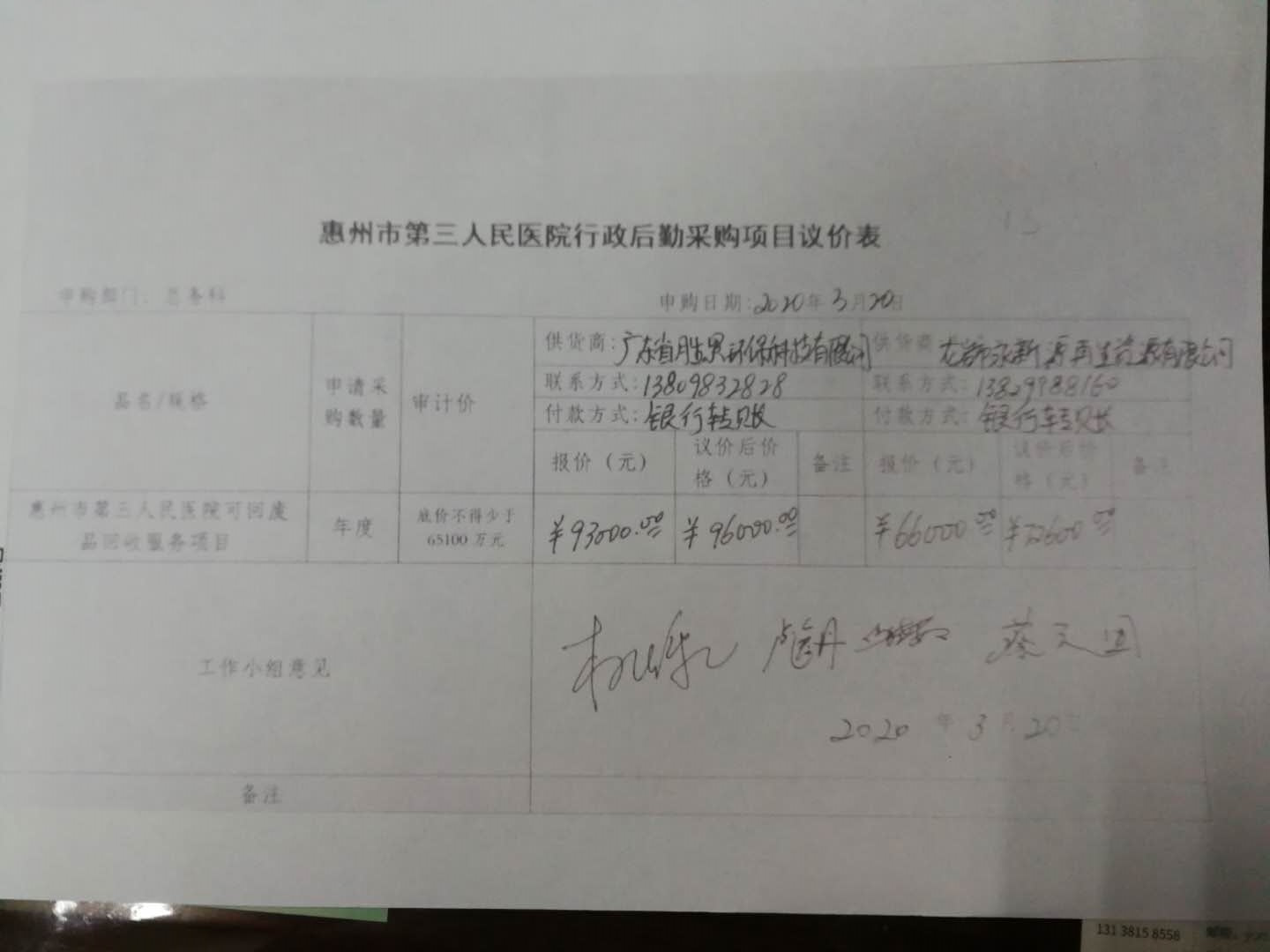 惠州市第三人民醫(yī)院可回收廢品回收議價結(jié)果