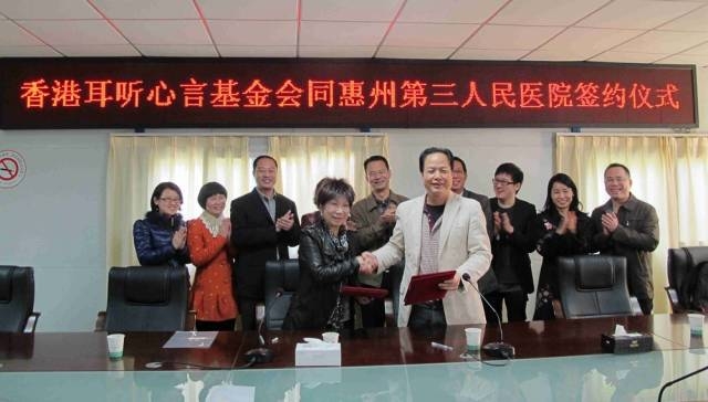 正因如此,醫(yī)者仁心,為給聾啞的孩子們做點(diǎn)事情,為不讓惠州乃粵東地區(qū)的聽障兒童的成長悲劇發(fā)生,王豪主任邁開了他的志愿公益腳步——經(jīng)過他與“耳聽心言” 基金會(huì)主席、著名耳科專家唐志輝教授進(jìn)行反復(fù)多次協(xié)商溝通,終于,在他的努力下,惠州市第三人民醫(yī)院與耳聽心言基金會(huì)達(dá)成合作,決定將“香港耳聰工程”公益項(xiàng)目在惠州設(shè)立站點(diǎn)。2015年5月8日上午,香港耳聰工程十周年慶典活動(dòng)在惠州市第三人民醫(yī)院隆重舉行,“耳聰工程惠州站”同步宣告成立!于是,名醫(yī)薈萃、充滿慈善公益正能量的耳聰工程拉開了造?;葜菽酥粱洊|聽障患者的序幕!