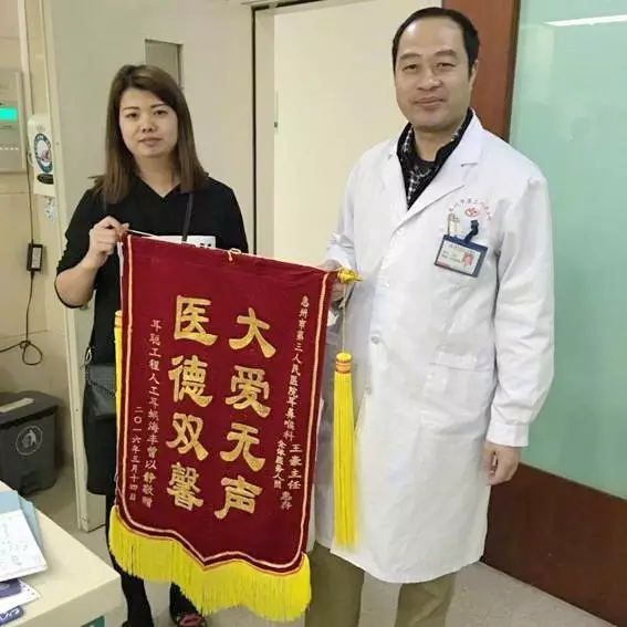 收到類似的這樣的感謝留言、感謝信,感謝錦旗,對(duì)惠州市第三人民醫(yī)院耳鼻咽喉頭頸外科王豪主任來說,其實(shí)已經(jīng)不是什么新鮮事了!現(xiàn)在科室的墻上就掛滿了全國各地患者送來的錦旗。每一面錦旗背后都有一個(gè)感人的故事。而這些故事,大多跟一個(gè)公益慈善項(xiàng)目——“耳聰工程惠州站”有關(guān)!