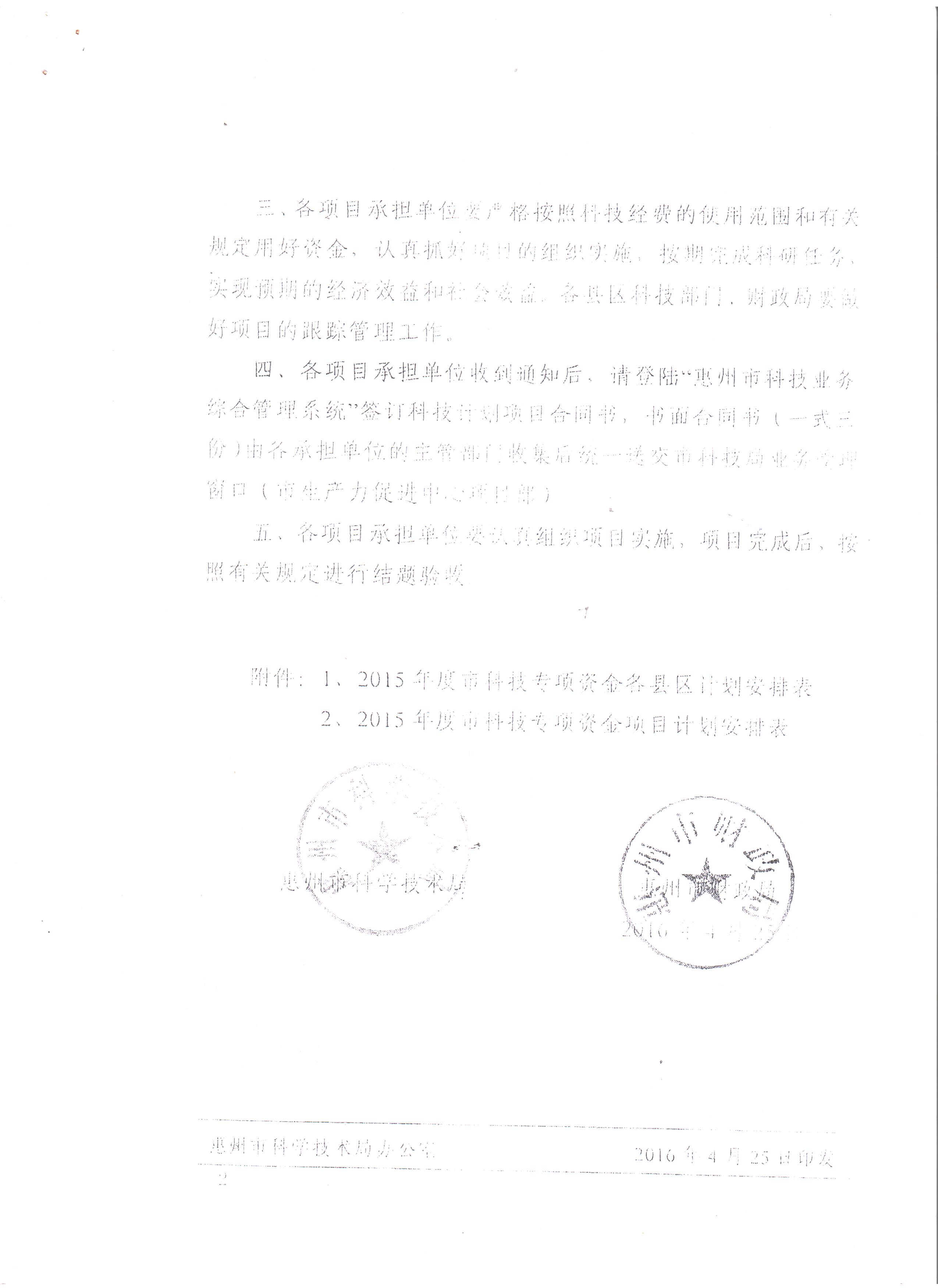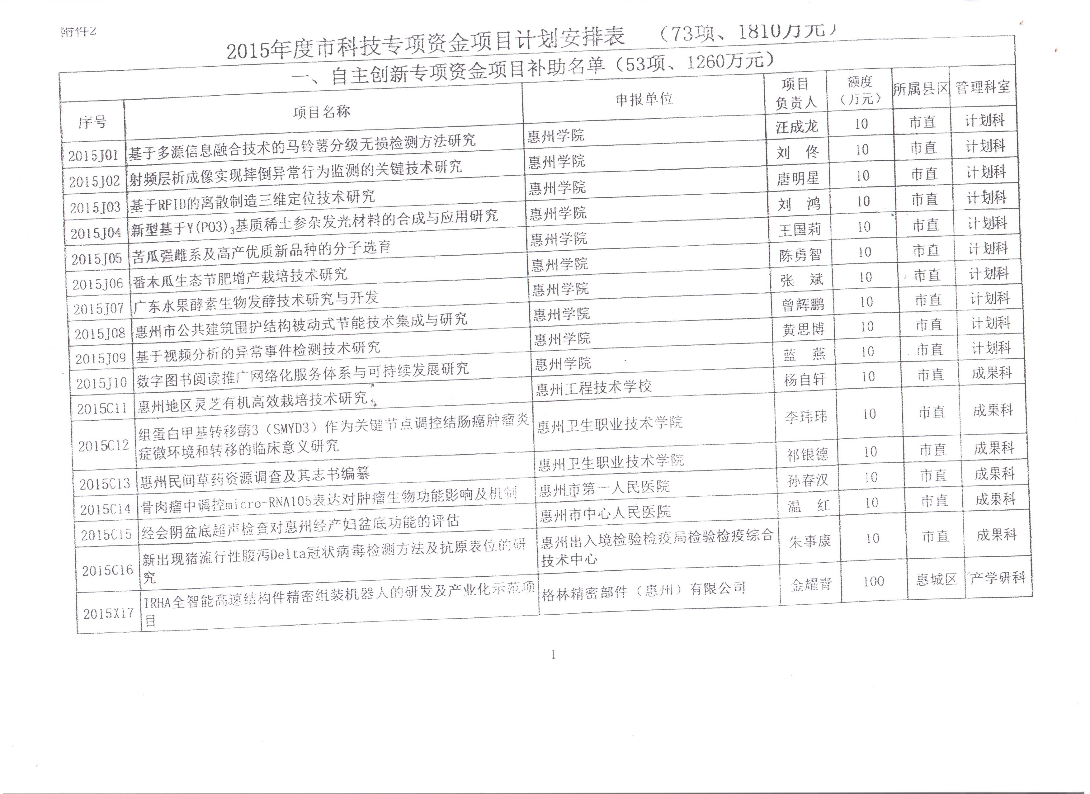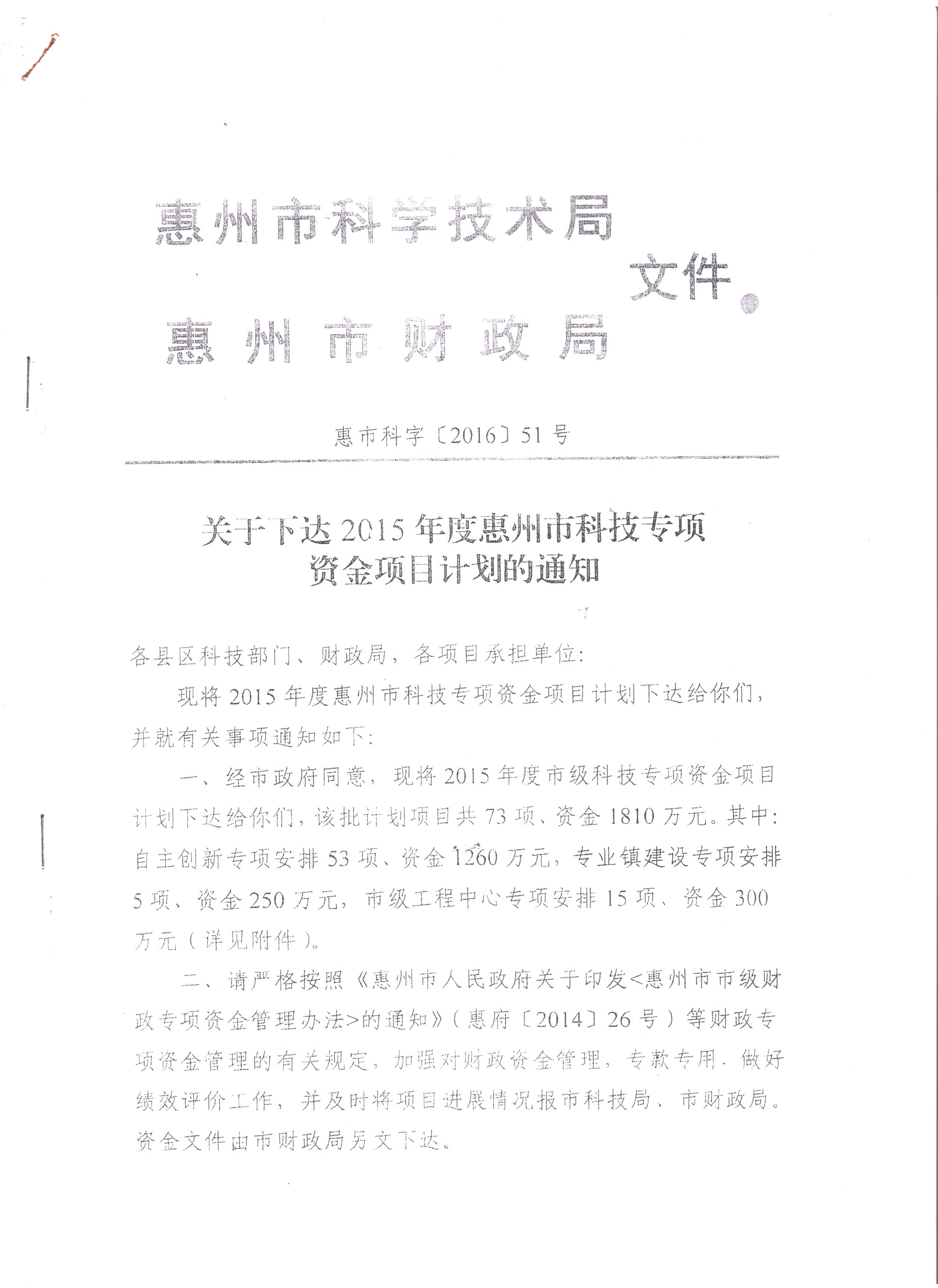 關于下達2015年度惠州市科技專項資金項目計劃的通知