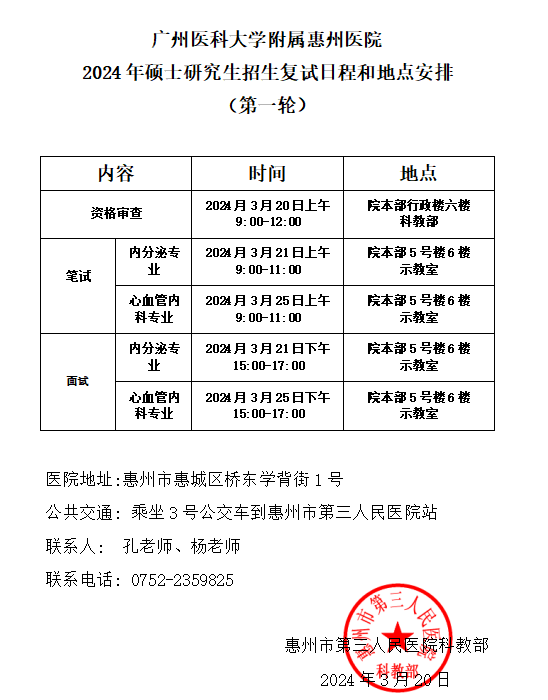 廣州醫(yī)科大學(xué)附屬惠州醫(yī)院 2024年碩士研究生招生復(fù)試日程和地點安排 (第一輪)