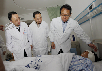 威爾斯親王醫(yī)院唐志輝教授(右)、惠州市第三人民醫(yī)院王豪專家(中)、煙臺毓璜頂醫(yī)院張杰專家為術后的患者進行查房