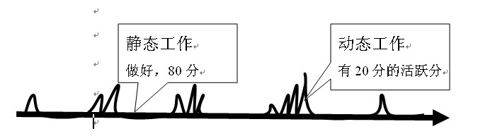 如果以100分來算,做好靜態(tài)工作,則可得80分;而做動態(tài)工作,則有20分的活躍分。平時一個只做好靜態(tài)工作,能得80分是比登天還難的,也是不可能的。而做好動態(tài)工作,得到80分就很容易,這就是為什么身邊有許多成功的人。同時在圖上可以看到靜態(tài)工作是相對穩(wěn)定的、波動不大的;而動態(tài)工作是沒有規(guī)律、不穩(wěn)定的。