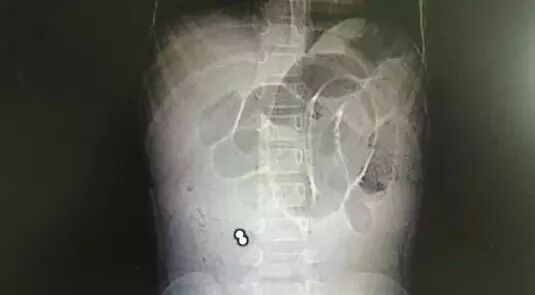 如片子所示,患者右下腹可見兩個圓圓的小球,顏色越白,說明物體的密度越高,高度懷疑是小鐵球之類的東西。這兩個小球是腸梗阻的罪魁禍首嗎?