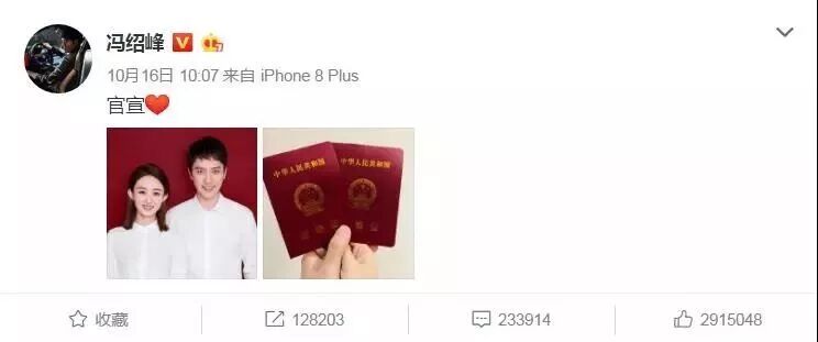 10月16日,馮紹峰和趙麗穎的“官宣”發(fā)布結(jié)婚的消息可是滿滿的灑了一地的狗糧,朋友圈還一度被他們的“官宣”體刷了屏。