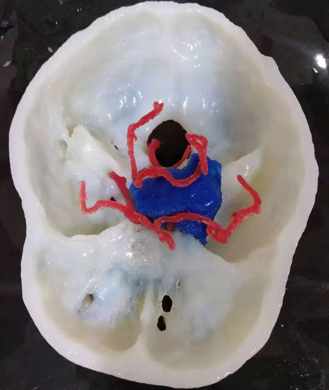 術(shù)前,為了充分地了解腫瘤大小、形態(tài)、位置及毗鄰組織,方便制訂手術(shù)計(jì)劃和術(shù)前溝通,李雪松醫(yī)療團(tuán)隊(duì)打印了1:1的3D模型,并在實(shí)驗(yàn)室對(duì)手術(shù)入路涉及到的顱底結(jié)構(gòu)進(jìn)行解剖教學(xué)和演示。