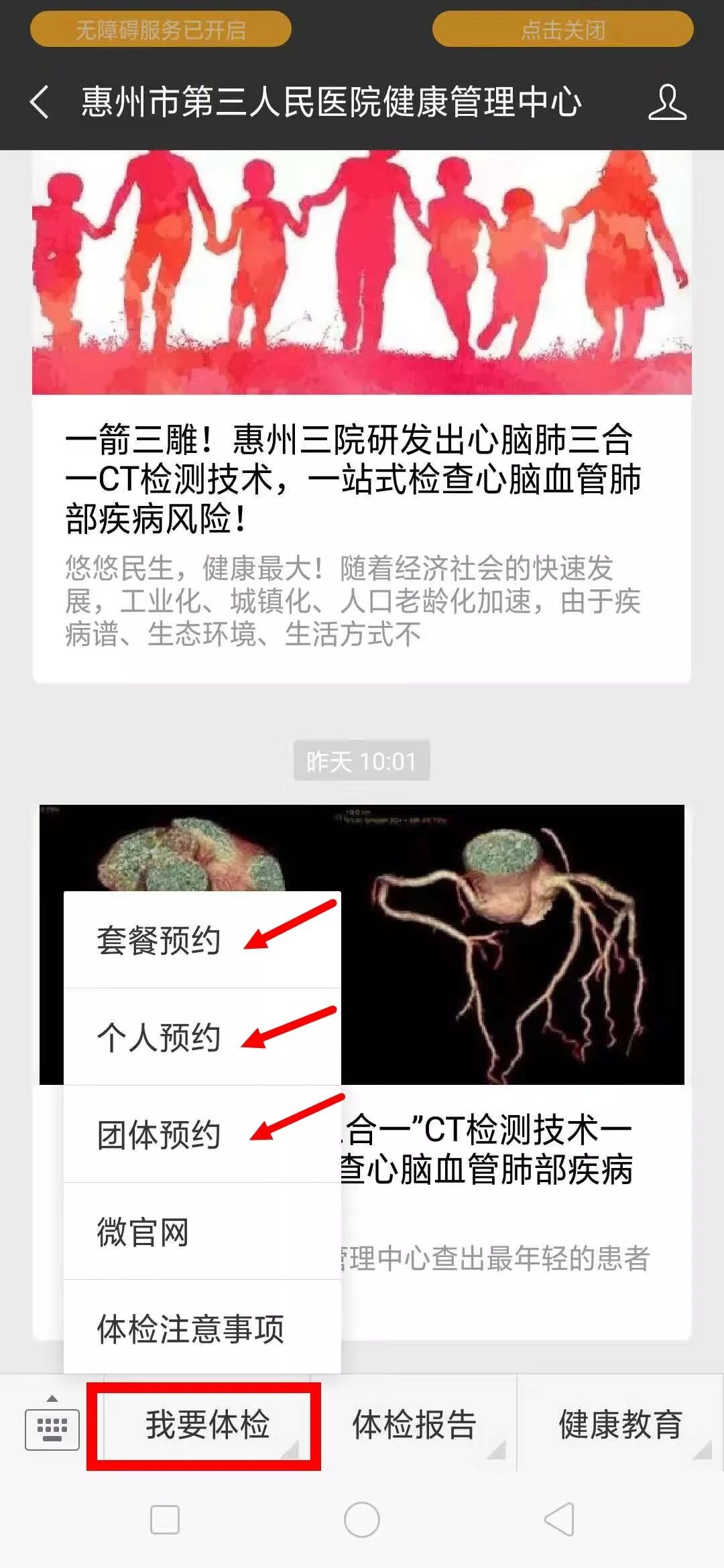 ③微信預(yù)約:登錄惠州市第三人民醫(yī)院健康管理中心微信公眾號——完成注冊——點擊“我要體檢”——“個人預(yù)約”或“團(tuán)體預(yù)約”——選擇套餐——預(yù)約體檢日期
