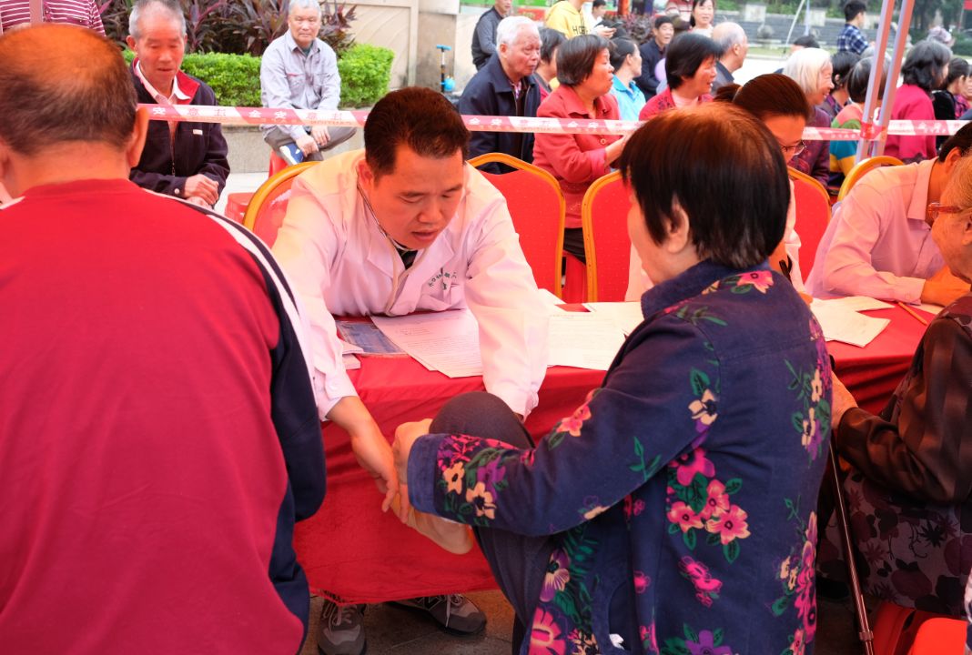 水口社區(qū)衛(wèi)生服務中心醫(yī)生為患有高血糖的慢性病居民檢查足背動脈搏動