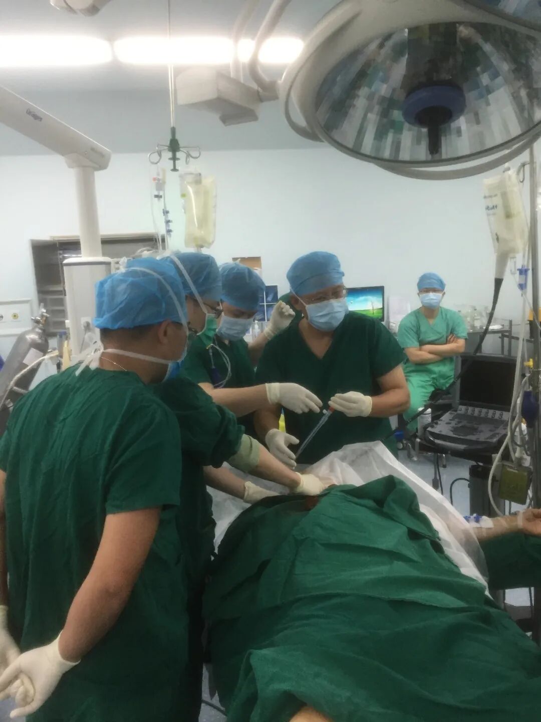 麻醉科龍宏杰主任(左四)親自為患者穿刺麻醉