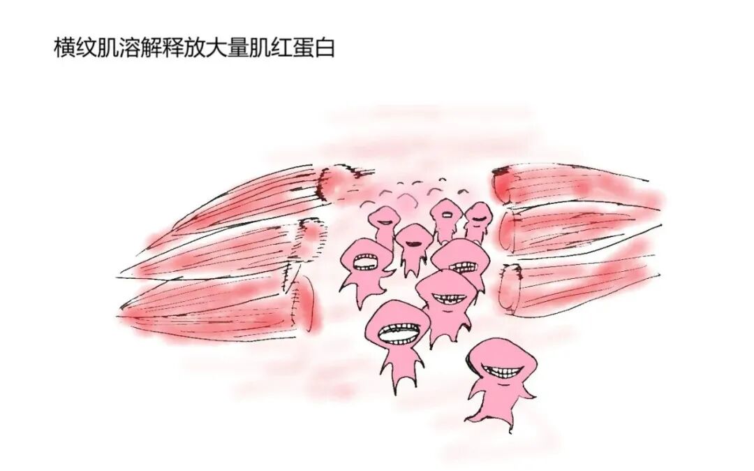 大量的肌紅蛋白釋放到血液里面,會隨著血液來到腎臟,大部分肌紅蛋白會隨著尿液排出人體,引起尿液像醬油樣、濃茶樣或紅酒樣。