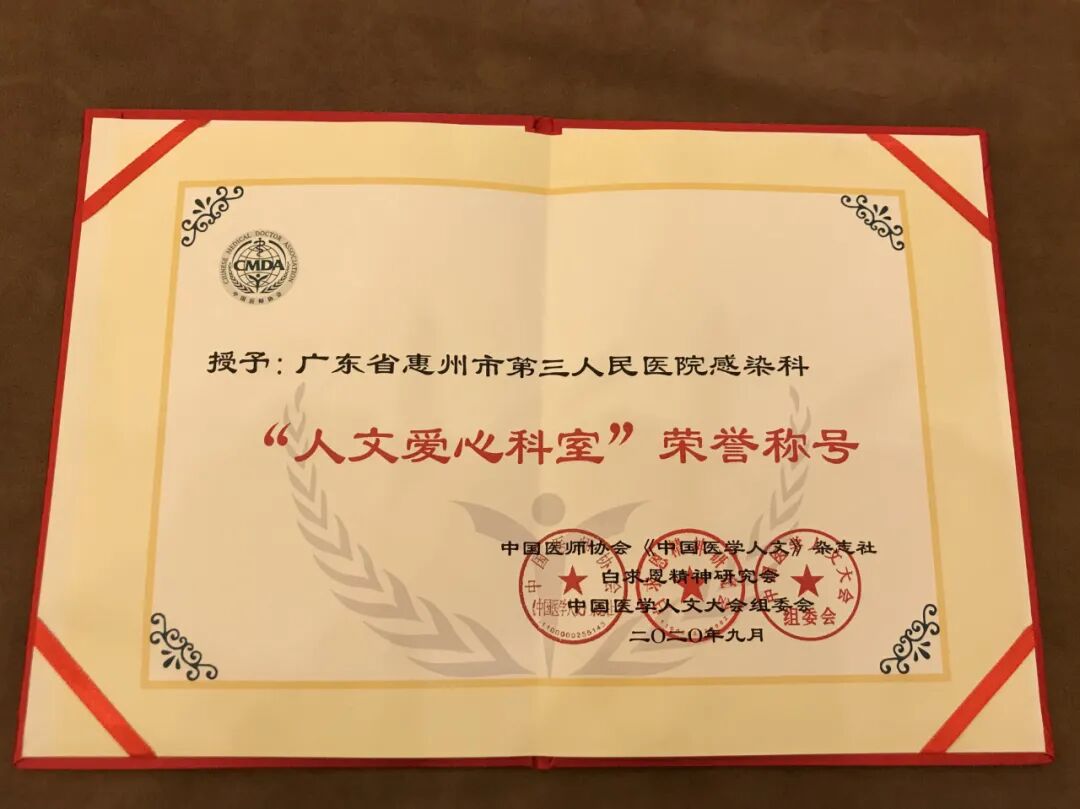 人文管理,同心戮力。惠州市第三人民醫(yī)院是全國(guó)人文愛心醫(yī)院,2020年3月成功躋身“2019年廣東省改善醫(yī)療服務(wù)行動(dòng)計(jì)劃示范醫(yī)院”。在人文氛圍濃厚的大家庭中,感染科是其中一個(gè)團(tuán)結(jié)拼搏、一往無(wú)前的優(yōu)秀團(tuán)隊(duì)。2015年獲得惠城區(qū)人民政府頒發(fā)的“科學(xué)技術(shù)獎(jiǎng)三等獎(jiǎng)”;2018年獲得惠城區(qū)衛(wèi)計(jì)系統(tǒng)“優(yōu)秀護(hù)理集體”;2020年獲得惠城區(qū)“三八紅旗集體”等榮譽(yù)稱號(hào)。