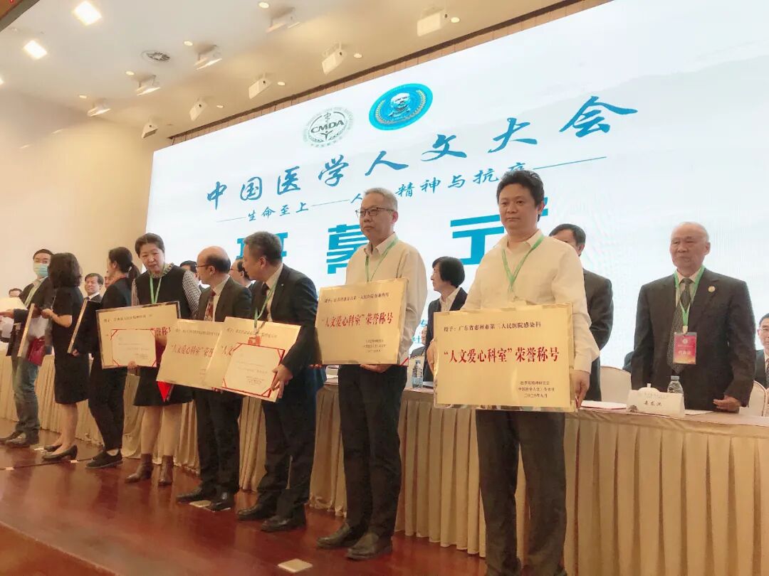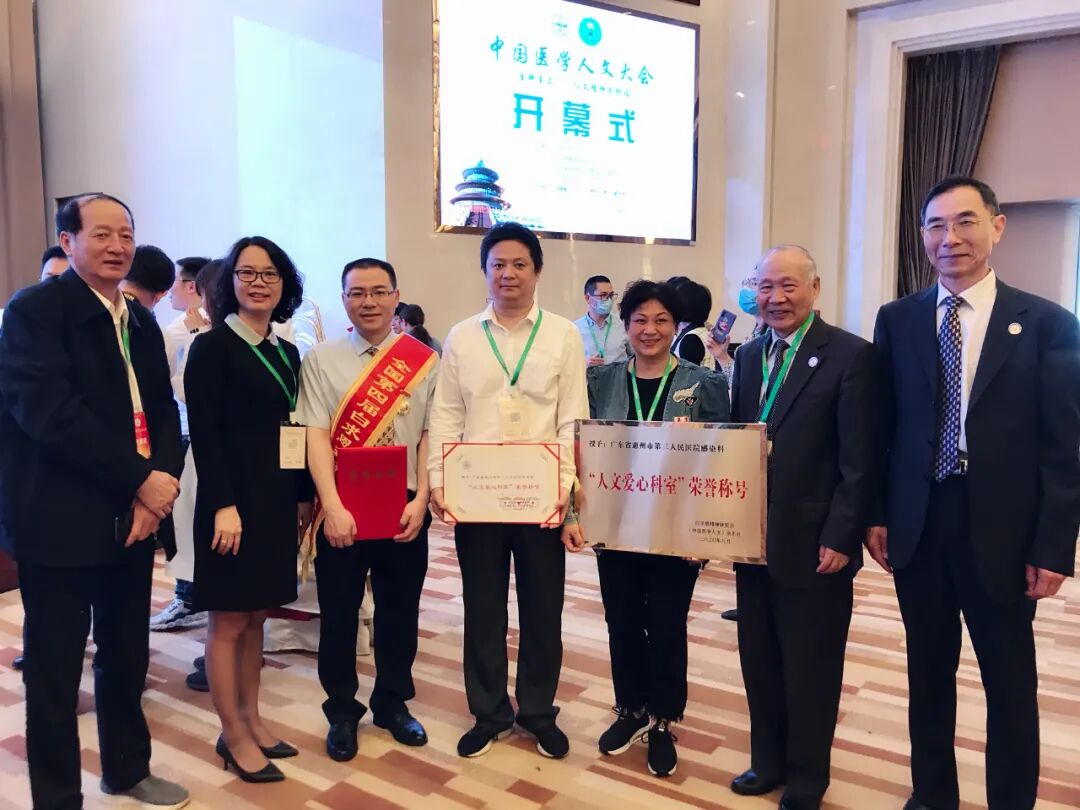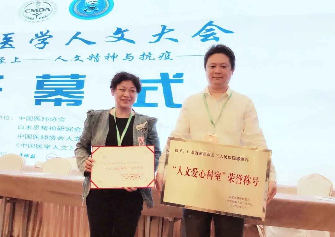 惠州三院感染科利旭輝主任(右一)、陳海英護(hù)士長(zhǎng)在頒獎(jiǎng)現(xiàn)場(chǎng)